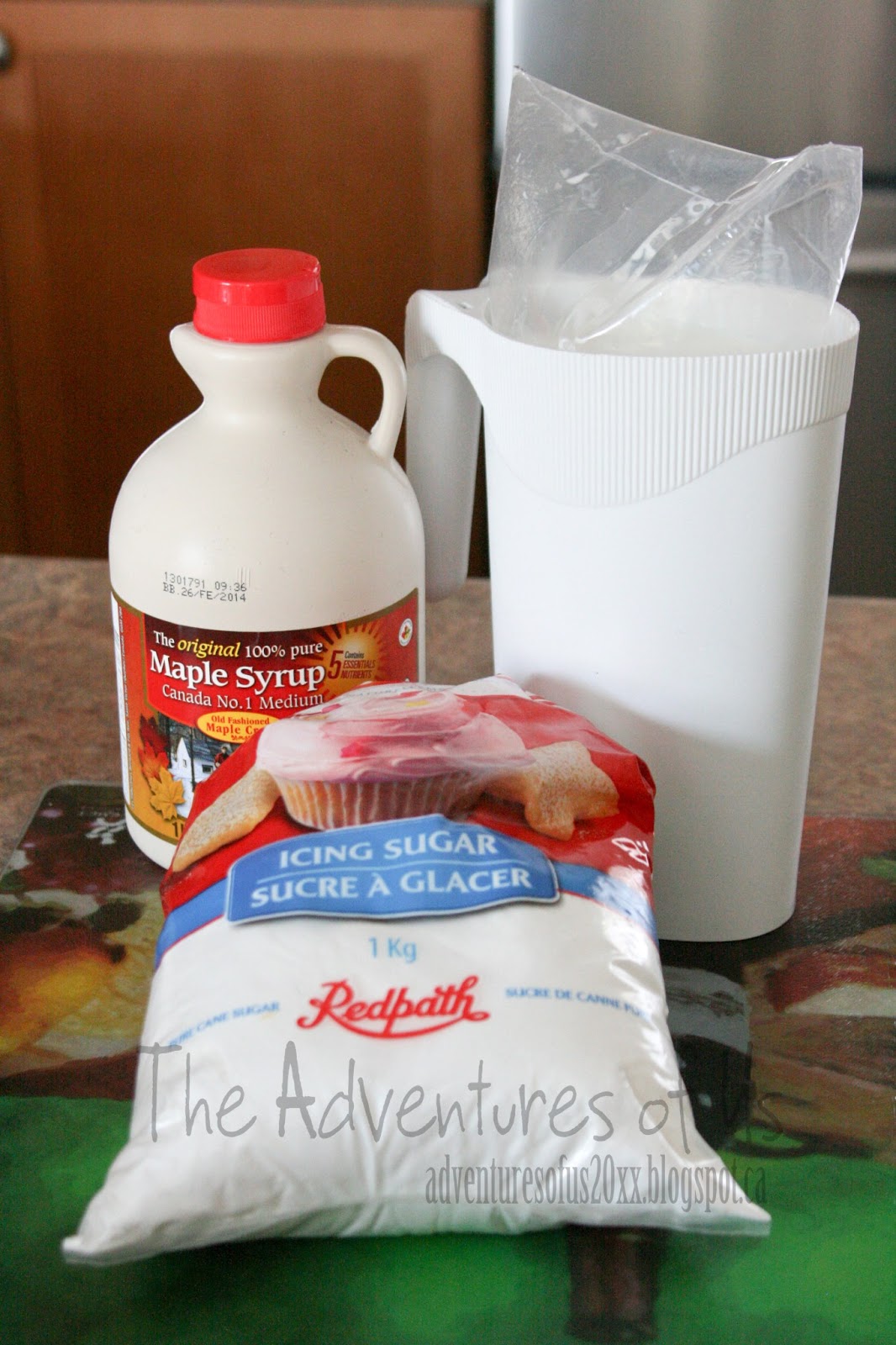 As the minis bake, make the icing to drizzle over them as soon as they come out of the oven and are warm. The three items you will need are - milk, icing sugar, and maple syrup.